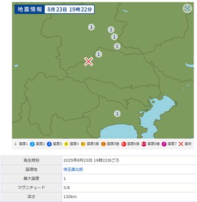 観測結果:そして予測どおり、2025年8月23日には埼玉県北部でM3.8の地震が発生しました。これは「前兆波からわずか4日後」に確認されたもので、予測の精度を裏付ける重要な事例となりました。
