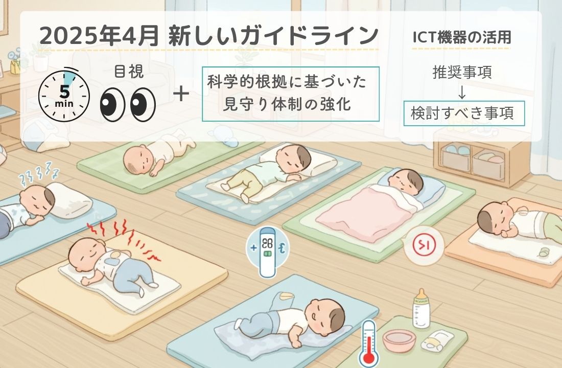 新基準では、従来の目視による呼吸確認に加えて、客観的なデータに基づく見守りが重視されています。具体的には、うつ伏せ寝の検知精度向上、呼吸パターンの異常検知、室温・湿度の自動管理などが含まれます。また、記録の電子化も義務化され、紙ベースでの管理から脱却し、より正確で継続的なデータ管理が求められるようになりました。さらに、職員間での情報共有体制の強化や、保護者への透明性のある報告システムの構築も新たに盛り込まれています。