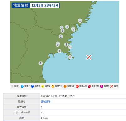 その後、12月3日に宮城県沖 M4.1(深さ50km) が発生しており、前兆波との一致が確認されました。