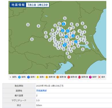 この予測は、2025年7月1日に茨城県南部で発生したM3.5の地震により的中したことが確認されています。
