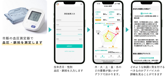 五行ドクターは、こうした理論をデータで裏付ける無料の健康管理ツールです。特許技術を活用し、血圧と脈拍から五臓のバランスを計算して、直感的なグラフや色で表示します。
