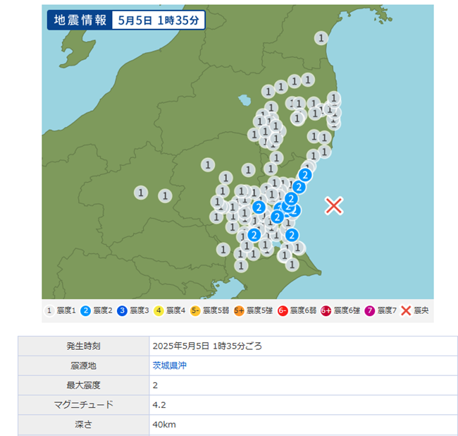 ●地震発生:2025年5月5日茨城県沖M4.2 D=40 L=140