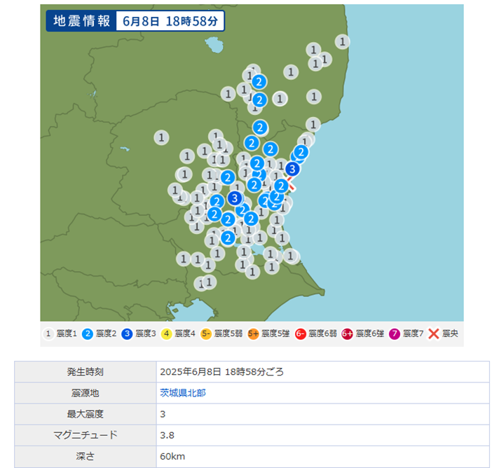 ●地震発生:2025年6月8日茨城県北部M3.8 D=60 L=115(鈴)