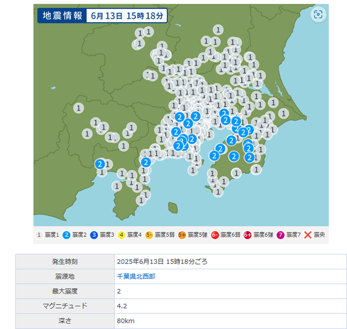 ●地震発生:2025年6月13日千葉県北西部M4.2 D=80 L=48(鈴)