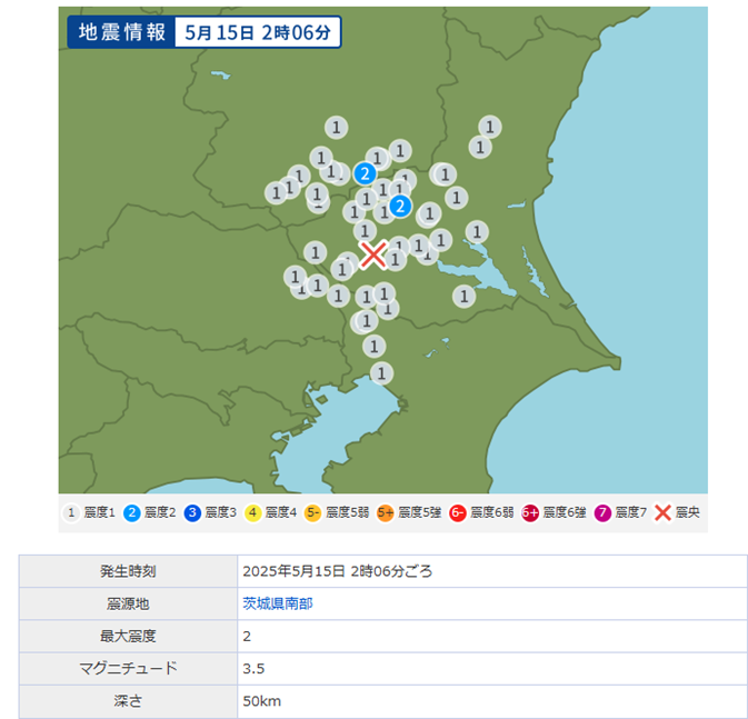 ●地震発生:2025年5月15日茨城県南部M3.5 D=50 L=43(鈴)