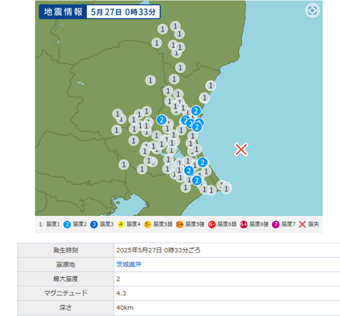 ●地震発生:2025年5月27日茨城県沖M4.3 D=40 L=130(鈴)