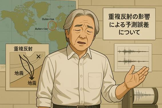 今回の信号は、日本海溝外側からのものではなく、フォッサマグナ西縁の地質構造を経由して届いた可能性があり、特に軟弱地盤による複数回の反射波が重なる「重複反射」が大きく関与していると推察されます。(下図参照)