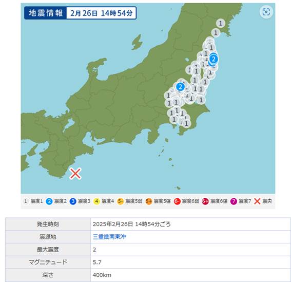 しかしその後の解析により、これらの前兆波は2025年2月26日に発生した「三重県南東沖M5.7(深さ400km、震央距離412km)」の前兆であった可能性が高いことが判明しました。