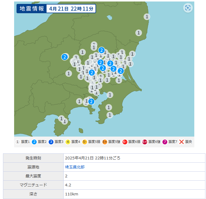 2025年 ,4月21日埼玉県北部M4.2 D=110 L(鈴)=29