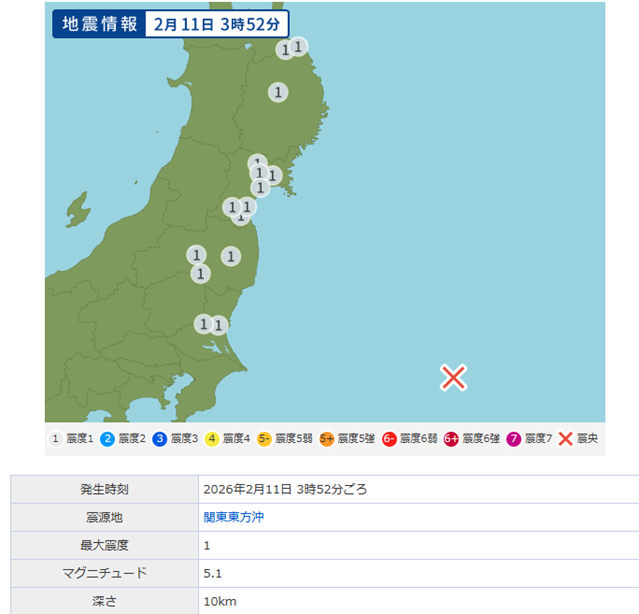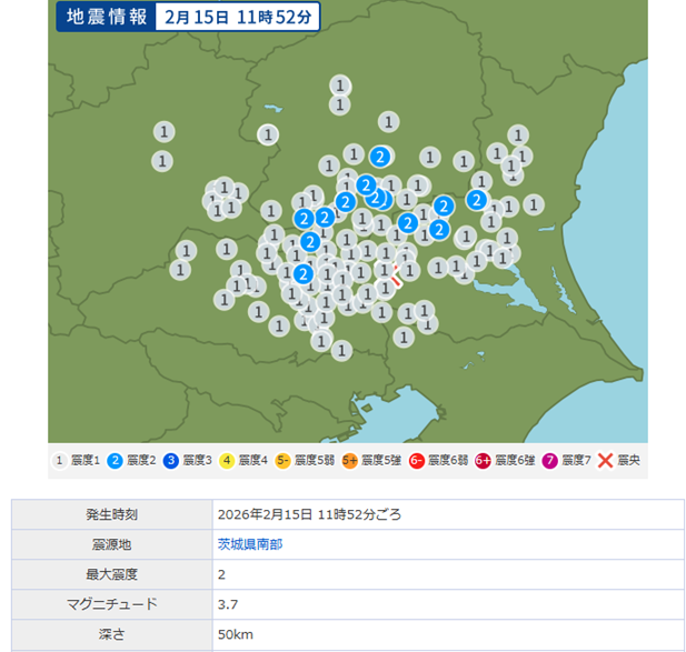その後、2月15日に茨城県南部を震源とするマグニチュード3.7、深さ約50kmの地震が発生しました。予測レンジ内での発生であり、時間的・距離的条件は概ね一致しました。