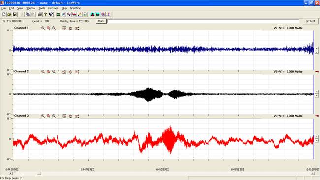 この波形では中盤から後半にかけて、特徴的な双峰構造(2つの山)を形成。これは地殻応力の解放過程に伴う微小破壊が断続的に発生していることを示唆しています。5日の観測データと比較すると、周波数帯が近似しており、同一のプレート運動に由来する連続現象と推定されます。