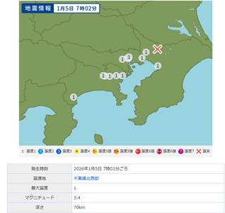 1/5 発生済 千葉県北西部M3.4 D=70 L(鈴)=44。