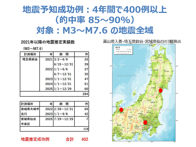 特に重要なのが、地震の規模が大きいほど、破壊核形成信号は遠くまで伝わる点です。マグニチュード7クラスの地震では、400km以上離れた場所でも信号を捉えられることが確認されています。また、観測地点が実際の地震で震度1以上を感じる距離にあれば、地震発生前の信号は十分に観測可能とされています。