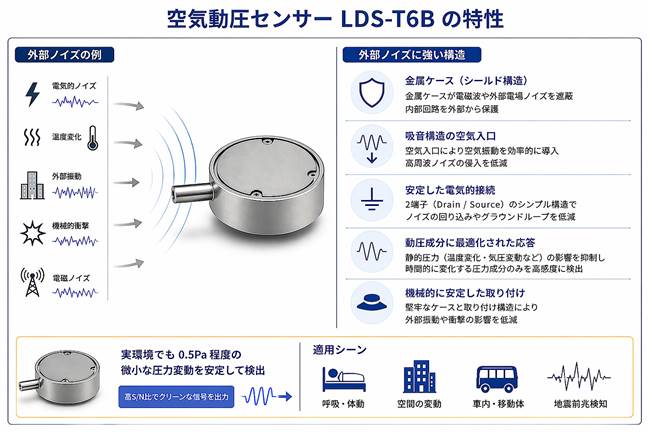 空気動圧センサーLDS-T6Bは、空気中の微小な圧力変動を高感度に検出するピエゾ式センサーであり(特許第7710729号)、音ではなく空気の圧力変化そのものを直接計測する点に特徴があります。